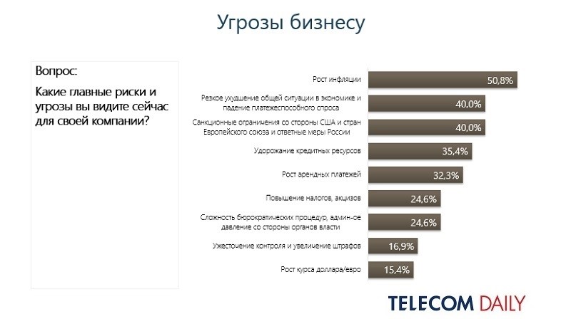 Операторы сообщили, что больше всего их бизнесу угрожает рост инфляции (51%), падение платежеспособного спроса (40%) и экономические санкции (40%).