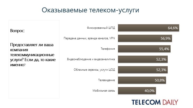 Среди них порядка 65% оказывают услуги фиксированного ШПД, передачи данных, аренды каналов и VPN — 57%, телефонии – 55%, осуществляют доступ к облакам и ЦОДам – 53%, видеонаблюдение и видеоаналитика — также 53%, телевидение — 51%.