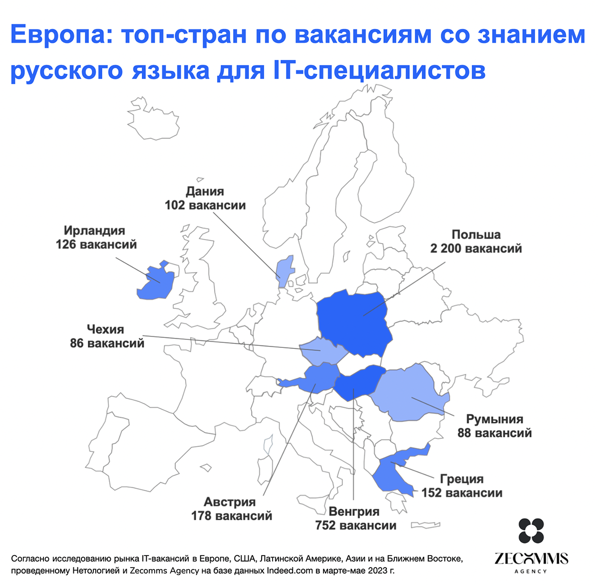 Чаще всего русскоязычных специалистов ищут в Польше (2 200 вакансий = 20% внутри страны), Венгрии (752 вакансии = 20% внутри страны), Австрии (178 вакансий = 4% внутри страны) и Греции (152 вакансии = 4% внутри страны).
