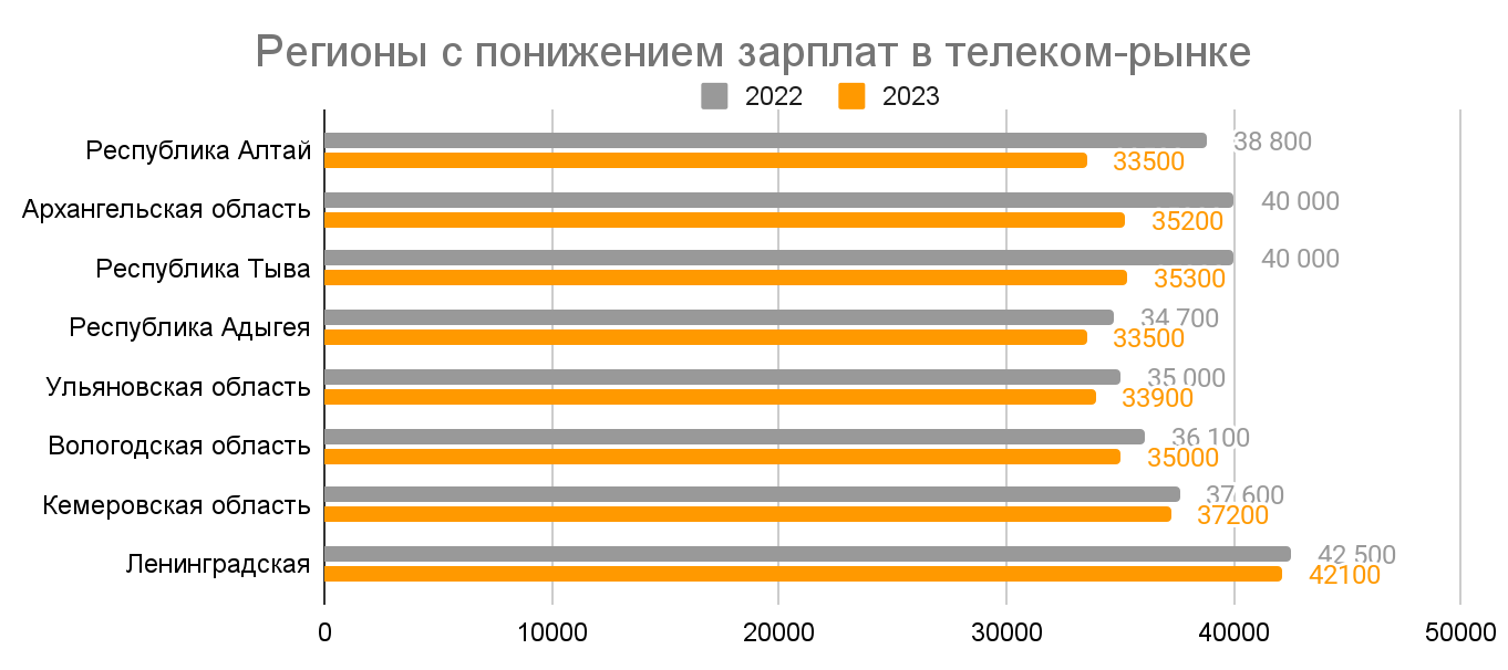 Также в первом полугодии 2023 года восемь регионов столкнулись с понижением средней медианной зарплаты в телеком-компаниях. Суммы окладов сократились в среднем на 6%. В сравнении с 2022 годом, когда зарплаты сократились в 18 регионах, понижение не считается критичным и массовым. Скорее, незначительное изменение среднего уровня зарплат связано с сокращением вакансий в крупных компаниях в конкретных городах и областях.