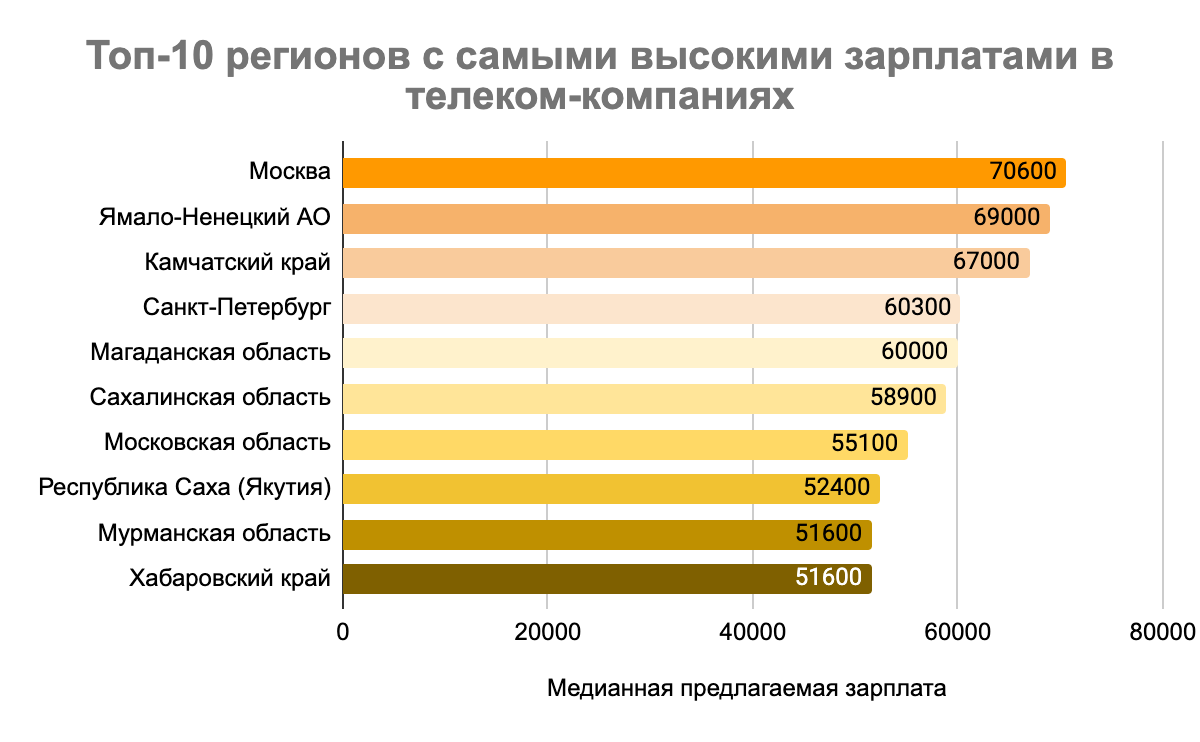 В ТОП-10 регионов с самыми высокими зарплатами вошли — Москва со средним уровнем оплаты труда 70 600 рублей, Ямало-Ненецкий АО, Камчатская область, Санкт-Петербург, Магаданская область, Сахалинская область, Московская область, республика Саха, Мурманская область, Хабаровский край замыкает десятку лидеров со средней зарплатой 51 600 рублей. В антирейтинг вошли Оренбургская область, республика Калмыкия, Смоленская область, Ульяновская область, Кабардино-Балкарская республика, Курская область, республика Адыгея, Алтай, Брянская область, Карачаево-Черкесская республика с диапазоном средних зарплат от 35 000 рублей до 30 000 рублей.