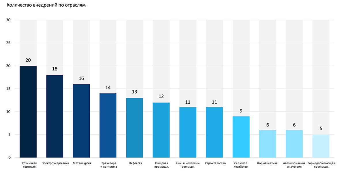 ТОП-3 областями с наибольшим количеством внедрений стали розничная торговля (67%), электроэнергетика (60%) и металлургическая промышленность (53%). Реже всего BI-инструменты используют фармацевтика, автомобильная индустрия и горнодобывающая промышленность: на них приходится 17% и по 20% соответственно.