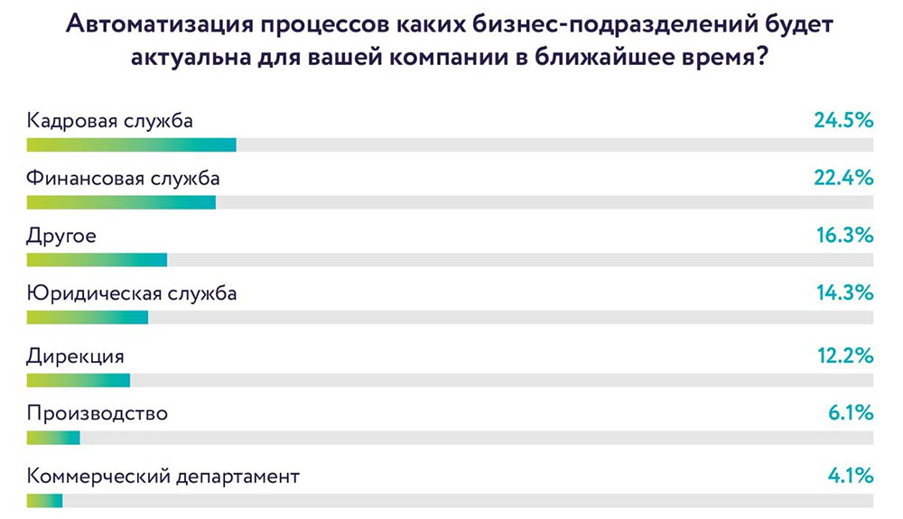 Если спрашивать ИТ-руководителей, автоматизация процессов каких бизнес-подразделений наиболее актуальна в ближайшее время, то наибольший приоритет у кадровой службы – 24% и у финансовой – 22%. При этом все компании стремятся адаптировать ИТ-решения под требования бизнеса, сделать их кастомизированными и удобными для пользователей.