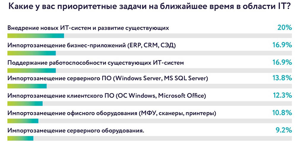 Наибольший приоритет в задачах в 2023 году отдан работе над бизнес-приложениями и развитию ИТ-систем – в сумме 54% руководителей отмечают своим приоритетом внедрение и развитие систем, поддержание работоспособности и импортозамещение их в случае необходимости. Импортозамещение ОС и СУБД остаётся в работе в 34% компаниях, включает в себя переход на импортонезависимое серверное и клиентское ПО, оборудование для офисов и сервера. Можно сделать вывод, что импортозамещение инфраструктурного ПО завершается.