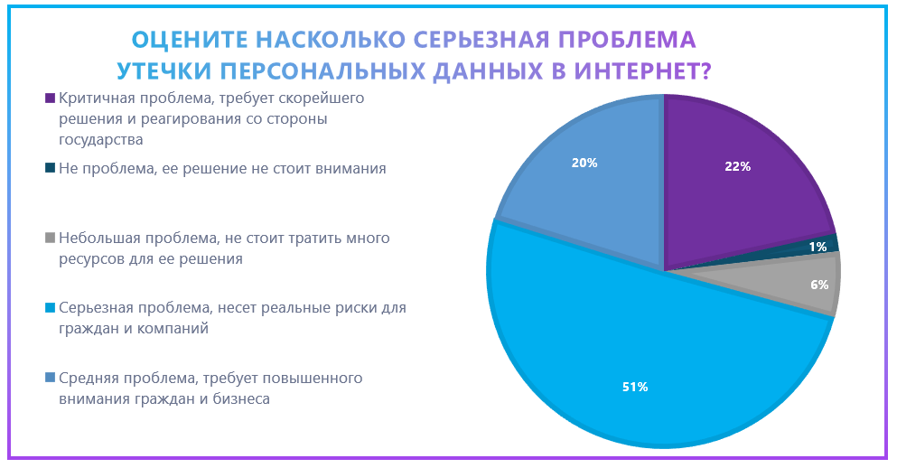 51% опрошенных считает, что проблема утечки персональных данных является серьезной и несет реальные риски для граждан и компаний. 6% считает, что небольшая проблема, на которую не стоит тратить много времени, и только 1% не считает, что это вообще проблема.