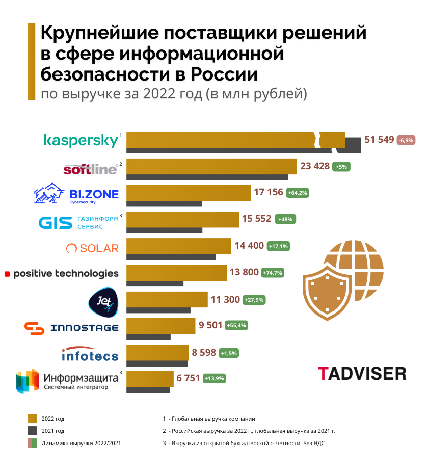 TAdviser оценил объем российского рынка информационной безопасности (ИБ) по итогам 2022 года, представил прогноз динамики на 2023 год и подготовил первый рейтинг 100 крупнейших отечественных ИБ-компаний.