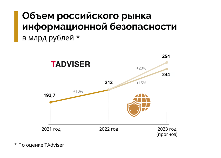 исследования TAdviser оценил объем российского рынка информационной безопасности за 2022 год в 212 млрд рублей, при этом динамика рынка составила порядка 10%. Рост рынка мог быть и больше, учитывая значительное увеличение выручки у многих отечественных ИБ-компаний, но на общую динамику оказал влияние уход с рынка зарубежных игроков. По мнению аналитиков TAdviser, 2023 год для российского рынка ИБ может завершиться ростом на 15-20%. В этом случае объем рынка достигнет 244-254 млрд рублей.