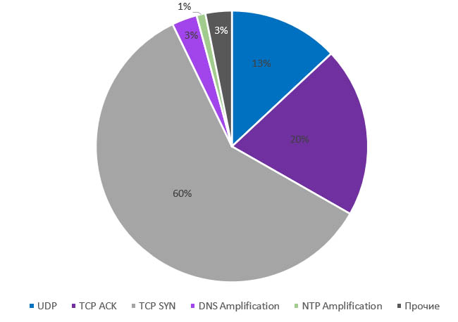 По сравнению со II кварталом 2023 года в III квартале 2023 значительно выросла доля TCP SYN-флуда, достигнув показателя в 60%, на втором месте (20%) расположился TCP ACK-флуд, UDP-флуд занимает третье место, сократив показатели с 27% до 13%. Доля атак типа DNS Amplification, составила всего 3%, показав снижение, а вот доля NTP Amplification упала с 9% до 1%.