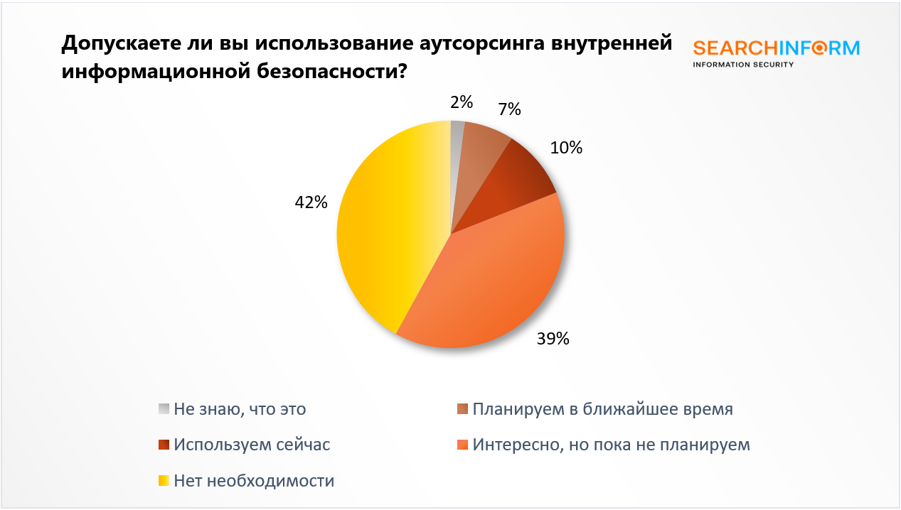 Это показали результаты опроса, проведенного «СёрчИнформ» среди 1200 начальников и сотрудников ИБ-подразделений, экспертов отрасли и руководителей российских организаций. Специалисты выяснили, что аутсорсинг внутренней информационной безопасности использует 10% компаний. Наиболее часто сервис внедряют компании сферы ИТ (17%), транспорта и логистики (17%), а также промышленности (14%).