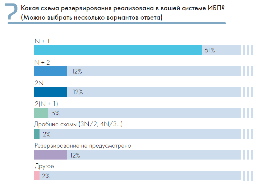 Для надежного, отказоустойчивого функционирования ИБП ЦОДы прибегают к различным вариантам их резервирования. Но наиболее популярной является одновременно и самая простая схема резервирования N + 1, ее используют более 60% респондентов. Более надежную, но и более дорогую схему резервирования 2N используют 12%. Явно недооценены респондентами дробные схемы резервирования (например, 3N/2), позволяющие обеспечить две независимые линии электропитания нагрузки (как в варианте 2N), но при этом повысить загрузку отдельных ИБП и снизить расходы.