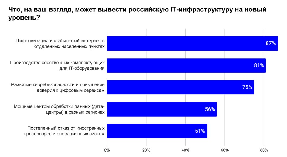 Отвечая на вопрос о том, что может вывести российскую IT-инфраструктуру на новый уровень, 87% участников опроса назвали цифровизацию страны и стабильный интернет в отдаленных населенных пунктах, 81% выделили как необходимое условие производство собственных комплектующих для IT-оборудования, 56% - строительство мощных Центров обработки данных (ЦОД) в разных регионах, а 51% - постепенный отказ от иностранных процессоров и операционных систем.