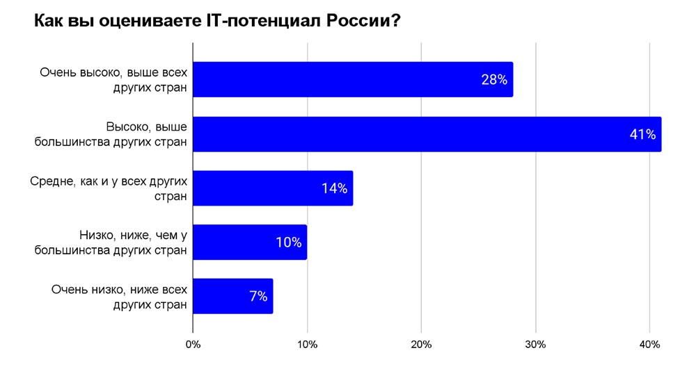 Только 14% респондентов считают, что IT-потенциал России не отличается ничем выдающимся, еще 17% оценивают его как низкий и очень низкий.