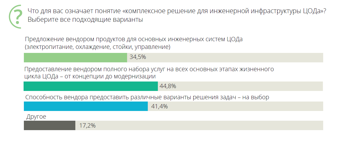 «Как показало исследование, около 45% компаний для своих будущих проектов планируют выбрать одного стратегического партнера-вендора либо для всего комплексного инфраструктурного решения, либо для каждой инженерной системы – электропитание, охлаждение, стойки/шкафы. Это означает, что основные ценности комплексного подходы остались актуальными», – отметил Александр Барсков, директор по контенту «ИКС-Медиа».