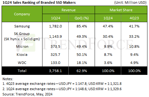 Выручка от продаж SSD-накопителей корпоративного класса в I квартале 2024 года выросла более чем на 60% и достигла $3,758 млрд. Наиболее активный рост показывают накопители с памятью QLC.