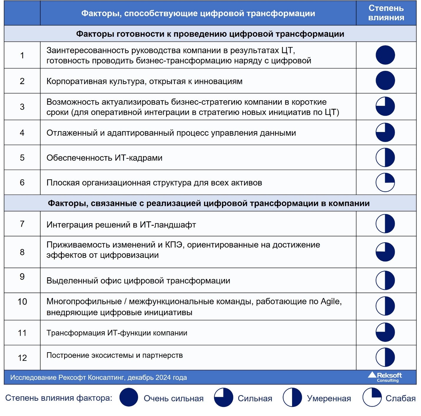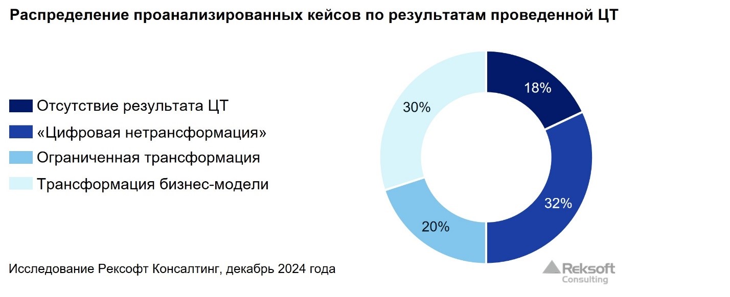 - Ограниченная трансформация — цифровые технологии изменили подход к решению бизнес-задач, изменились как бизнес-процессы, так и организационная структура, но не были поставлены новые стратегические бизнес-задачи, что ограничивало трансформацию.
