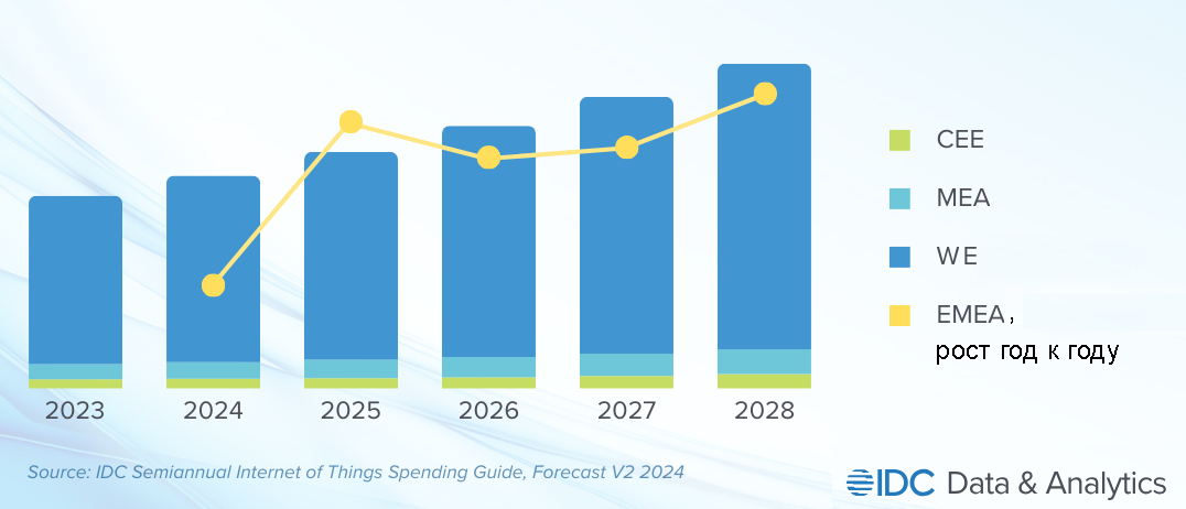 Среднегодовой темп роста расходов на интернет вещей (IoT) в Европе, на Ближнем Востоке и в Африке до 2028 года составит 11%. К 2028 году инвестиции в экосистему технологий IoT в регионе EMEA достигнут $283 млрд.