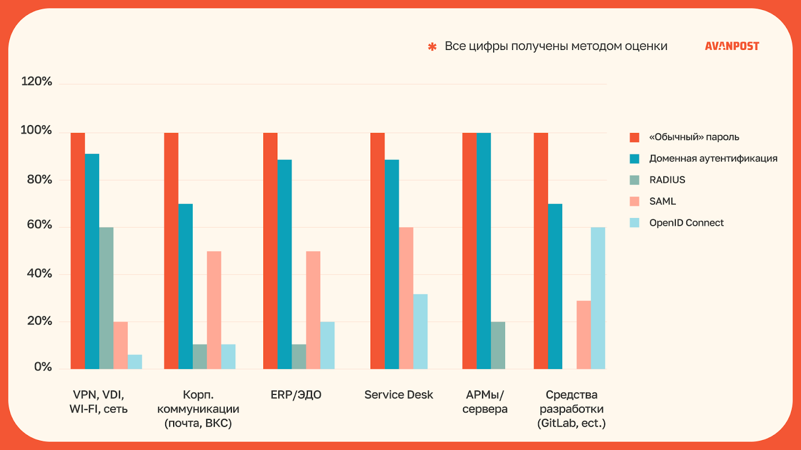 Эксперты Avanpost проанализировали реальную практику готовности бизнеса к современным подходам в аутентификации в 2025 году. В рамках исследования были рассмотрены самые востребованные классы решений корпоративной инфраструктуры: VPN, VDI, Wi-Fi и сеть; корпоративные коммуникации (почта, ВКС); ERP/ЭДО; Service Desk; АРМы и серверы; а также средства разработки (например, GitLab). В каждом из направлений оценивалась доля использования пяти различных методов аутентификации: "обычные" пароли, доменная аутентификация, RADIUS, SAML и OpenID Connect. Пользовательская аутентификация в различных онлайн-сервисах не являлась предметом исследования, рассматривалась только корпоративная аутентификация.
