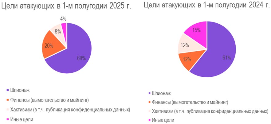 В 1 половине 2025 года шпионаж и финансовая выгода стали главными целями профессиональных хакеров почти в 90% атак, в то время как доля хактивизма постепенно снижается, но все еще представляет серьезную опасность. Вместе с этим злоумышленники стали тщательнее выбирать жертв – число атакованных индустрий за год сократилось на 40%, а на одну организацию теперь могут одновременно нападать сразу две-три группировки.