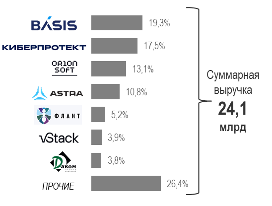 На рынке ПО УДИ в целом лидеры уже определились. Крупнейшими игроками стали «Базис», «Киберпротект», «Орион софт», «Группа Астра», «Флант», vStack, «Даком М». В настоящий момент они занимают более 70% объема этого рынка.