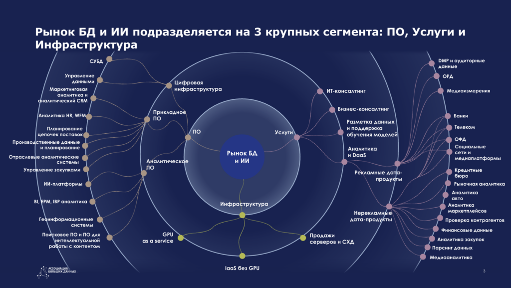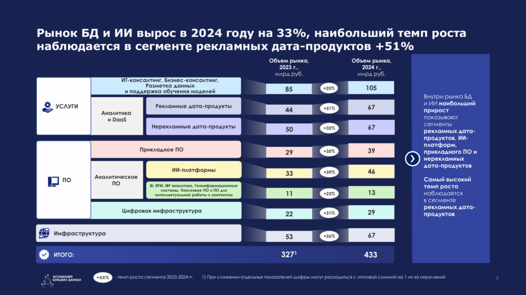 В результате активного развития к 2024–2025 годам объём рынка больших данных и ИИ в России превысил 430 млрд рублей, а ежегодные темпы в России составляли 25–35%, что заметно выше мирового среднего уровня.